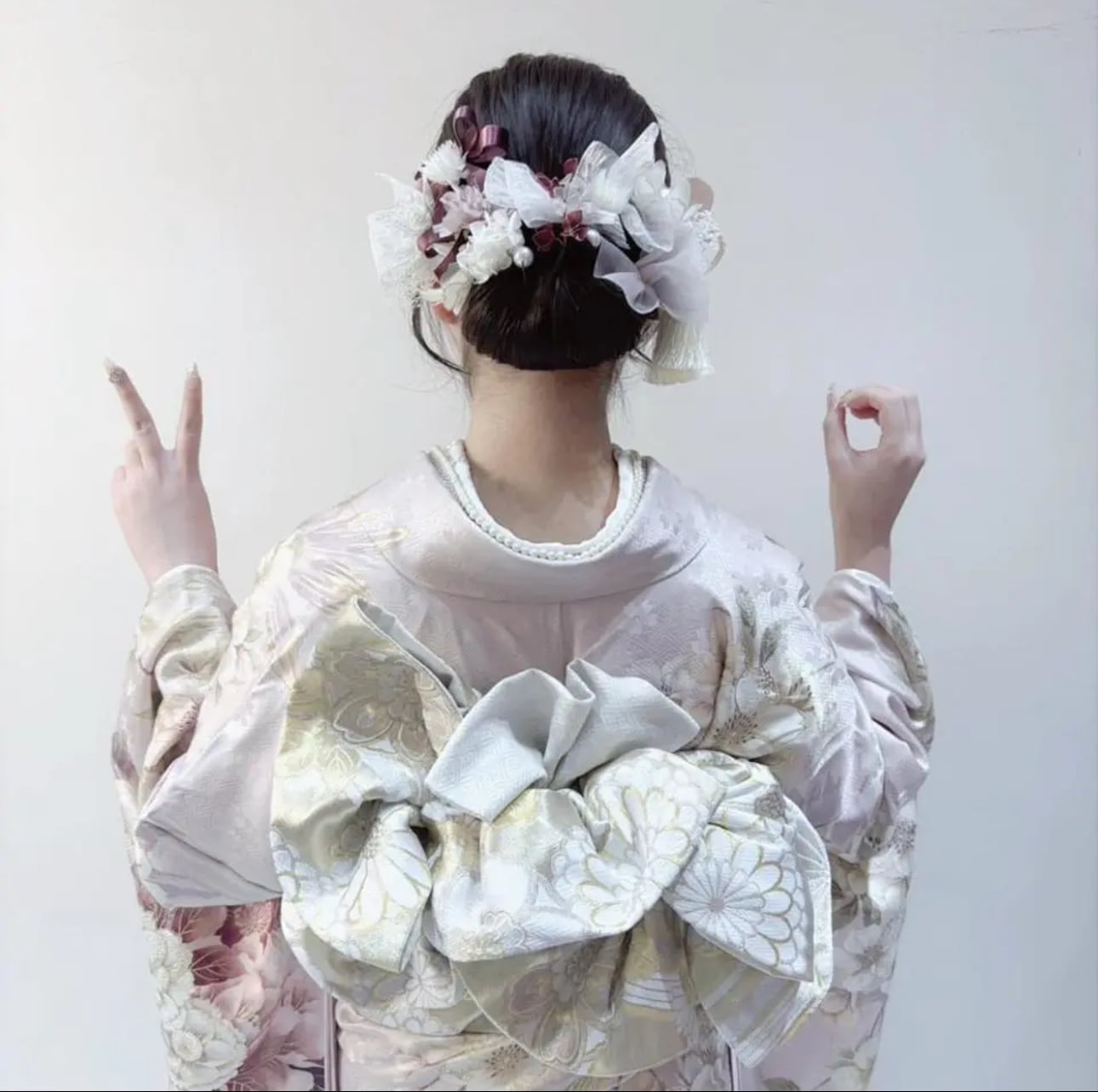 サイドに広がる花々とリボンが、和装スタイルに華やかさと柔らかさを添え、成人式や卒業式、結婚式、前撮りなど特別な日をより美しく引き立てます。