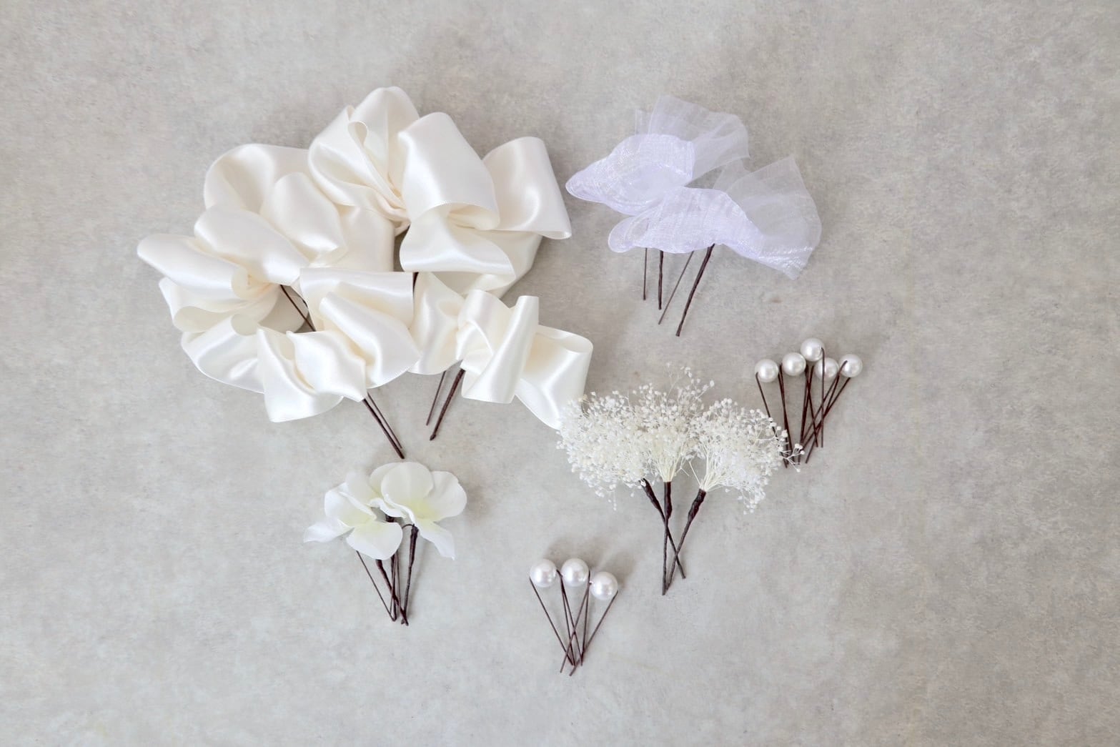 一つ一つパーツ分けされているサテンリボン、細やかなドライフラワーのかすみ草、白パール